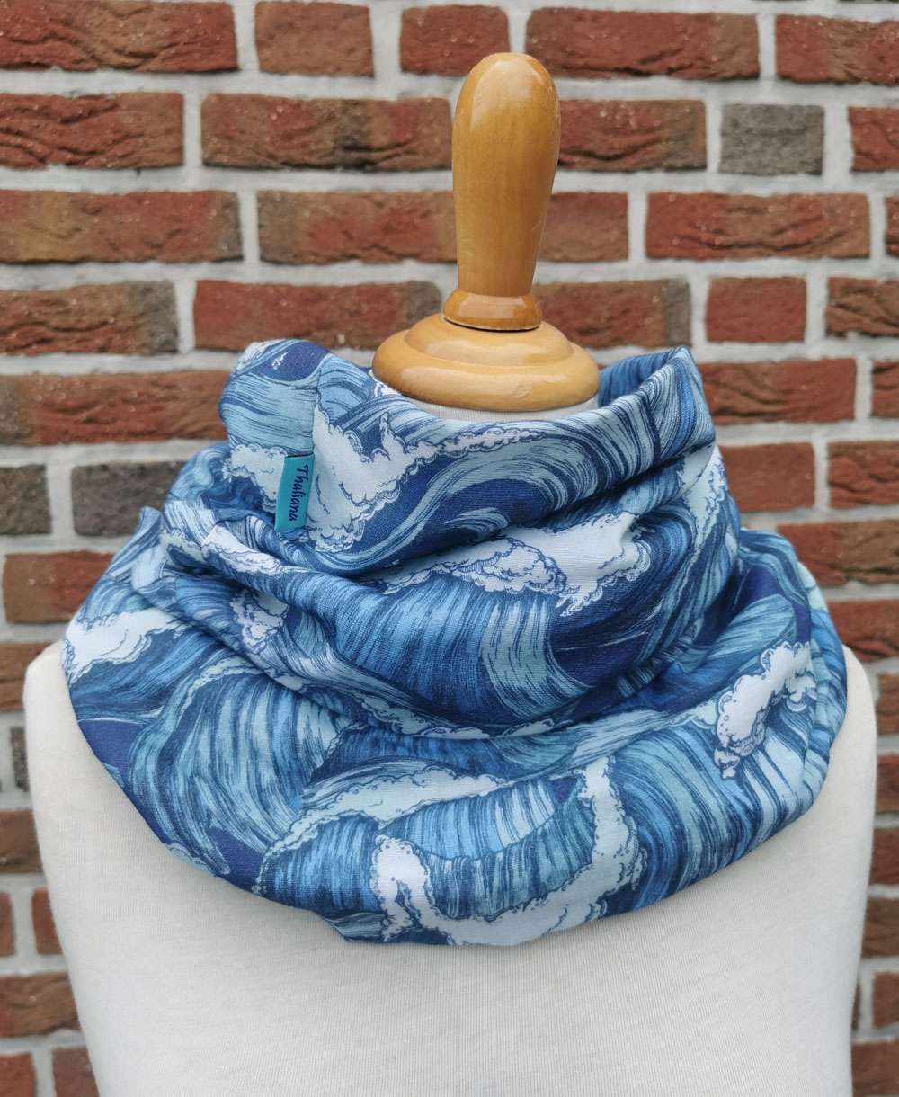 Für diesen Loopschal habe ich einen weichen, tragenangenehmen Musselin vernäht. Der Stoff besteht aus 100% Baumwolle und ist locker gewebt, wodurch sich ein lässiger Look ergibt, er ist in der Grundfarbe weiß und ist komplett mit einem wilden Wellenmotiv bedruckt. Der Schal ist das Richtige für alle, die vom Meer träumen ;) Der Schal ist mit ca 140cm Länge (im Ring geschlossen) doppelt gewickelt zu tragen und schützt so an warmen Tagen perfekt vor Zugluft. An kühleren Tagen verhindert er drinnen einen kalten Hals. Er kann natürlich auch einfach getragen werden, dann ist er mit seiner Breite von knapp 30cm schon fast eine Stola. Der Schal passt perfekt zu Jeans und anderen lässigen Outfits. Material: Musselin (Double Gauze) aus 100% Baumwolle, waschbar bei 30°C.