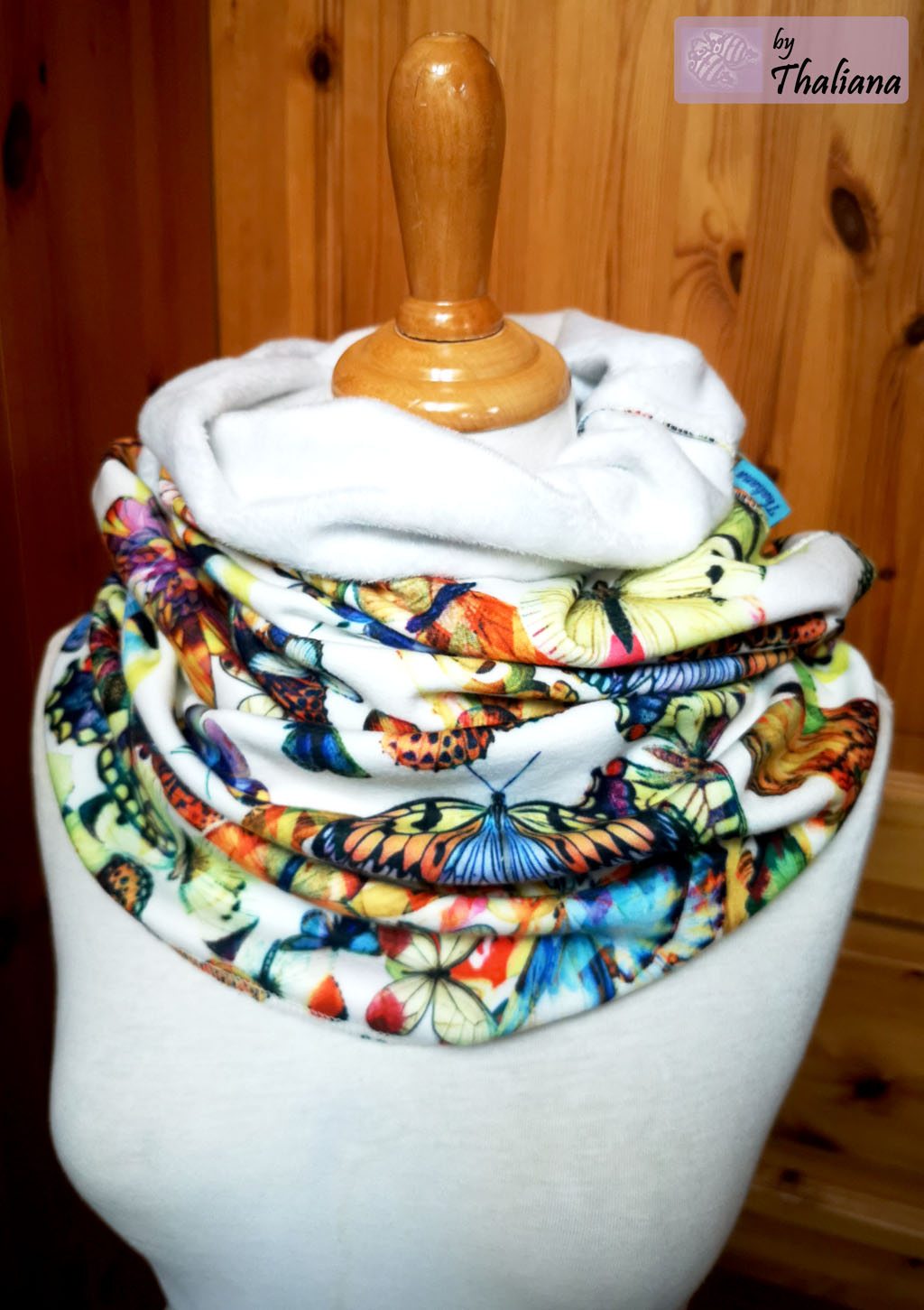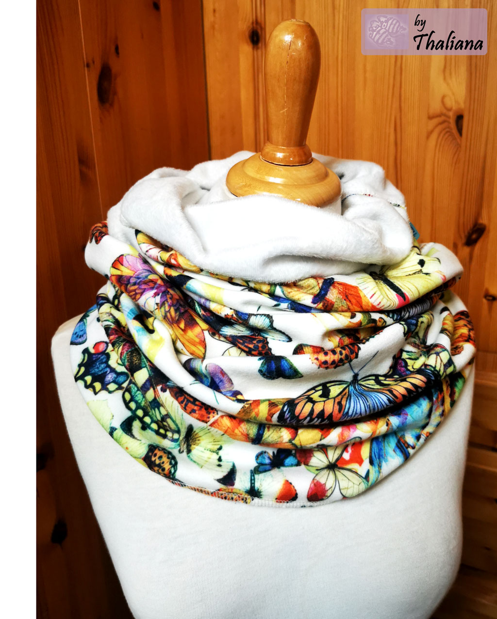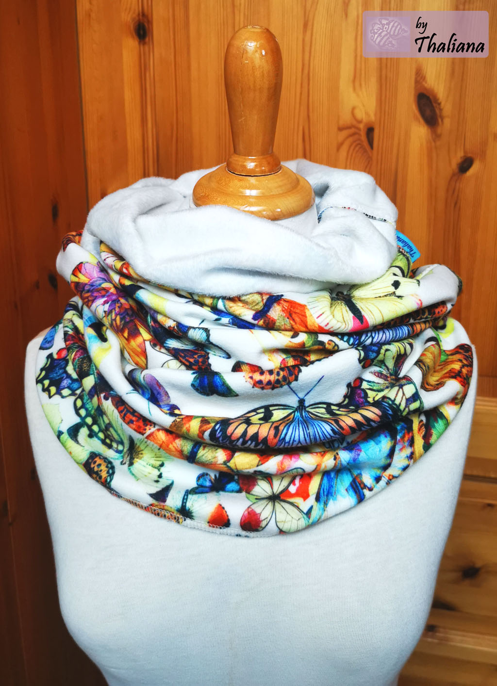 Für diesen tollen Hingucker-Schal habe ich einen mit knallbunten Schmetterlingen bedruckten Alpenfleece vernäht. Alpenfleece ist auf der Vorderseite wie ein T-Shirt-Stoff und auf der Rückseite kuschelig wie ein Fleece. Ich habe den Stoff einlagig verarbeitet, es kann also die bunte Seite oder auch die kuschelige Fleeceseite nach außen zeigend getragen werden. Je nachdem, wie bunt man es gerade haben möchte ;)