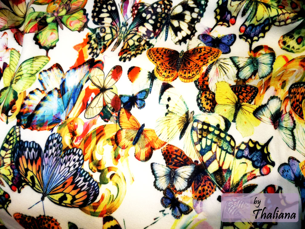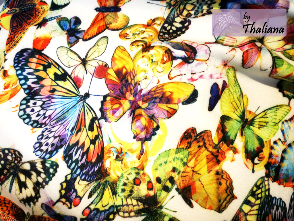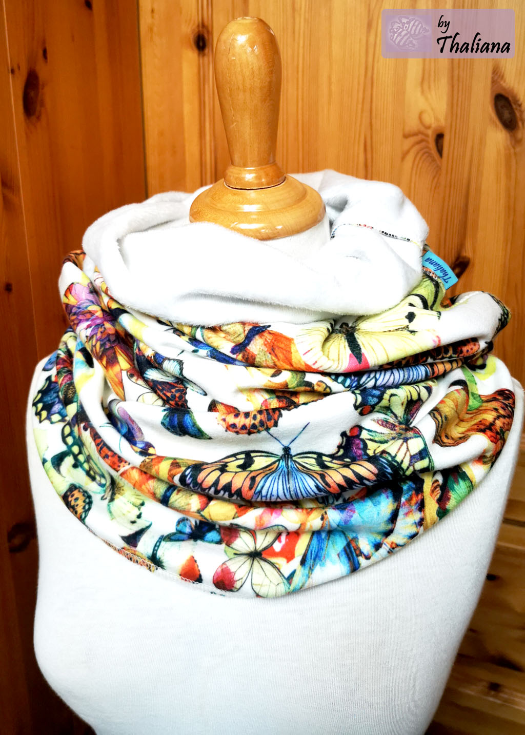 Für diesen tollen Hingucker-Schal habe ich einen mit knallbunten Schmetterlingen bedruckten Alpenfleece vernäht. Alpenfleece ist auf der Vorderseite wie ein T-Shirt-Stoff und auf der Rückseite kuschelig wie ein Fleece. Ich habe den Stoff einlagig verarbeitet, es kann also die bunte Seite oder auch die kuschelige Fleeceseite nach außen zeigend getragen werden. Je nachdem, wie bunt man es gerade haben möchte ;)