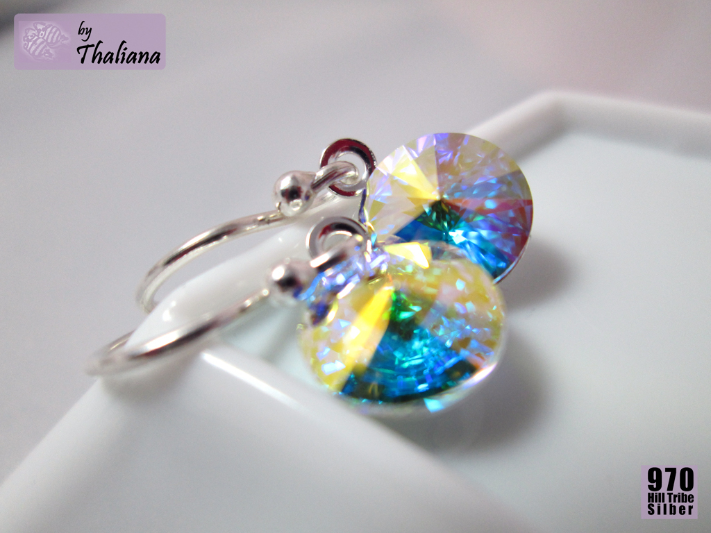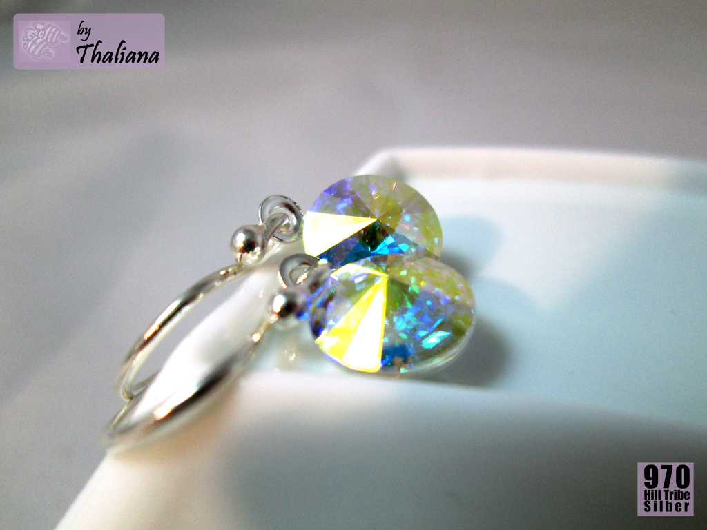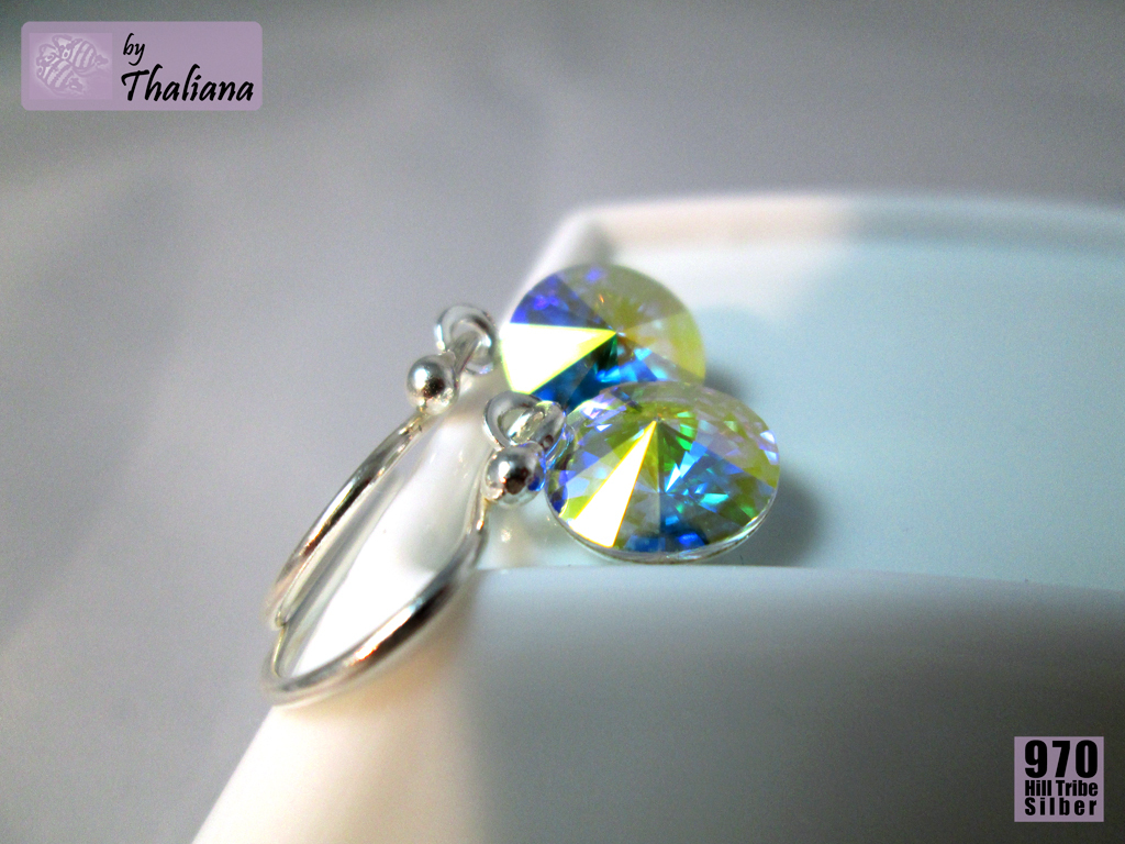 In versilberten Fassungen habe ich glitzernde Swarovski Elements montiert, in diesem Fall in einem Farbton, den ich Sternenstaub getauft habe: ein inneres Leuchten und Funkeln wie nicht von dieser Welt, in allen Farben des Regenbogens, auf transparenter Basis:)