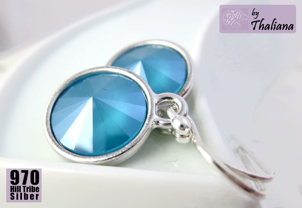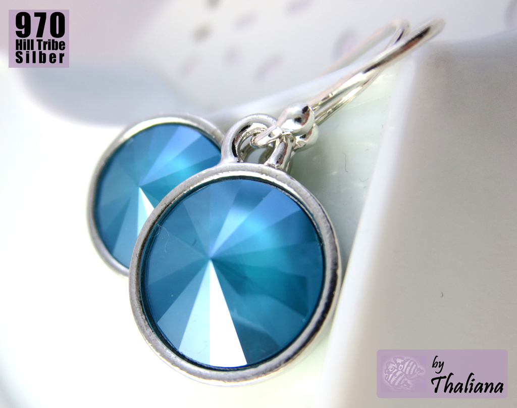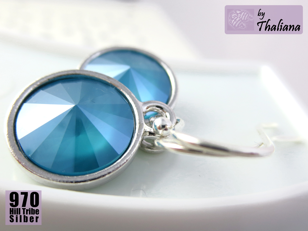 Superschöne, funkelnde Swarovski Elements in Rivoli-Form (petrol oder auch dunkles Türkis, mit einem tollen Farbeffekt: die intensive, vom Farbton her eindeutig kühle Farbe sitzt unten auf dem farblosen Kristall - dadurch erscheint der Kristall von der Seite fast farblos, von vorne petrolfarben mit einem zarten Mondlicht-schleier, wirklich ein supertoller Effekt!) habe ich montiert in versilberten, sehr hochwertigen Fassungen der Qualitätsmarke TierraCast aus den USA.