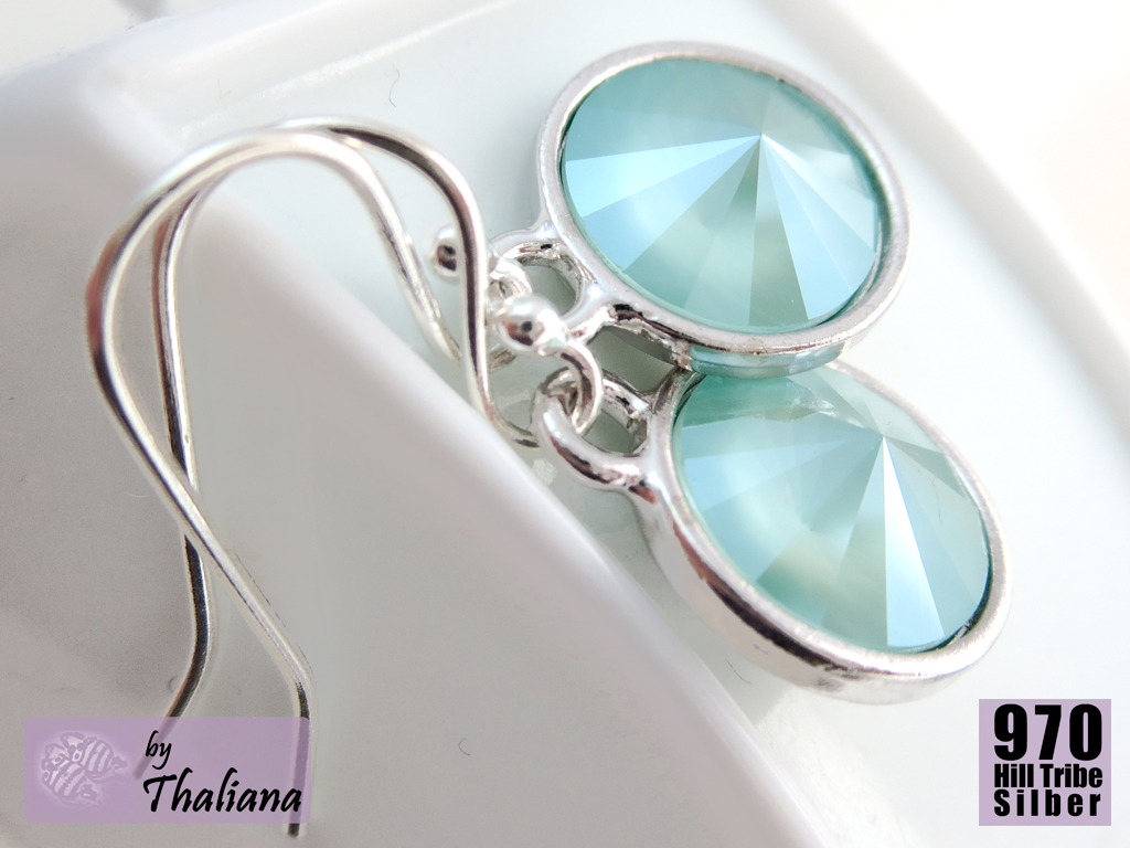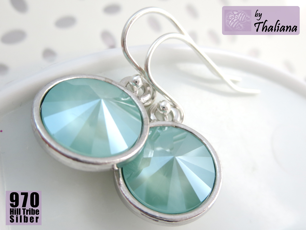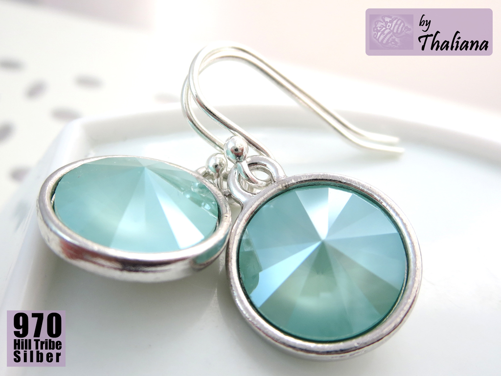 Superschöne, funkelnde Swarovski Elements in Rivoli-Form (mintgrün, mit einem tollen Farbeffekt: die zarte, mintgrüne Farbe sitzt unten auf dem farblosen Kristall - dadurch erscheint der Kristall von der Seite fast farblos, von vorne mintgrün mit einem zarten Mondlicht-schleier, wirklich ein supertoller Effekt!) habe ich montiert in versilberten, sehr hochwertigen Fassungen der Qualitätsmarke TierraCast aus den USA.