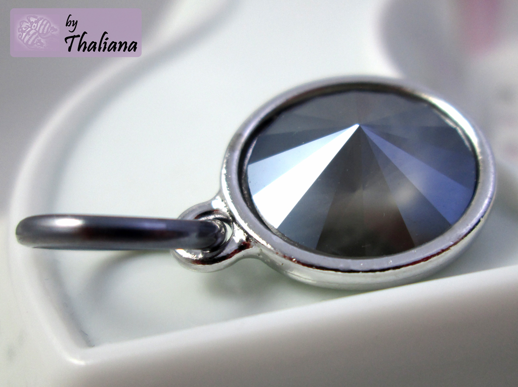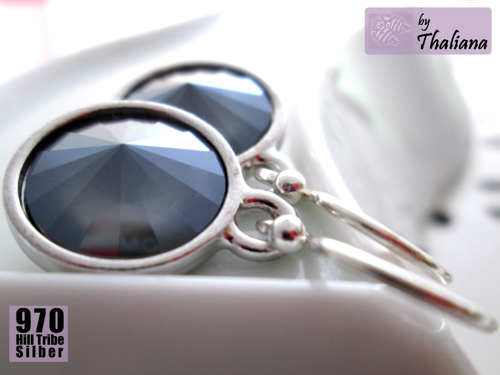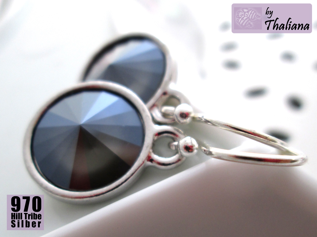 Superschöne, funkelnde Swarovski Elements in Rivoli-Form (mittleres Grau, mit einem tollen Farbeffekt: die recht intensive Farbe sitzt unten auf dem farblosen Kristall - dadurch erscheint der Kristall von der Seite fast farblos, von vorne aber satt grau mit einem zarten Mondlicht-schleier, wirklich ein supertoller Effekt, der in dieser Farbe wieder wunderschön rauskommt) habe ich montiert in versilberten, sehr hochwertigen Fassungen der Qualitätsmarke TierraCast aus den USA.