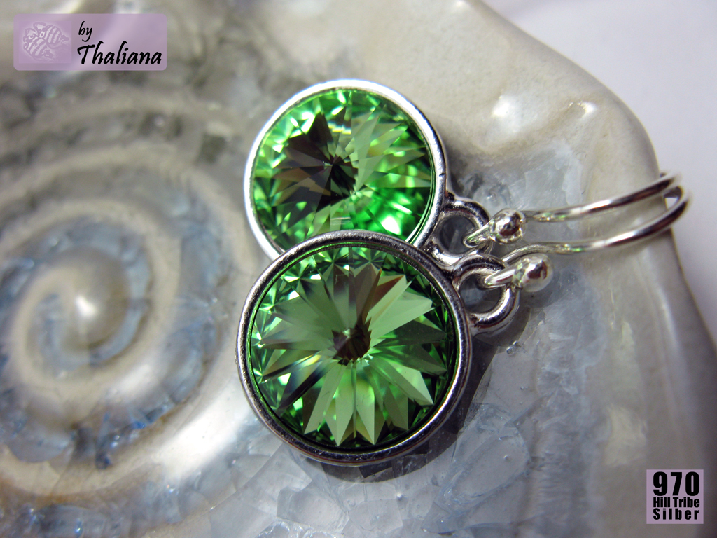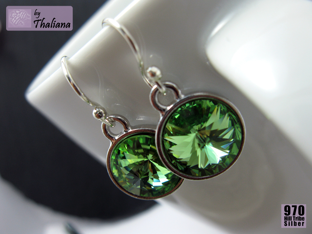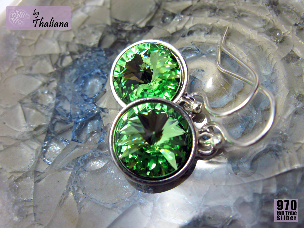 Superschöne, funkelnde Swarovski Elements in Rivoli-Form habe ich montiert in versilberten, sehr hochwertigen Fassungen der Qualitätsmarke TierraCast aus den USA.