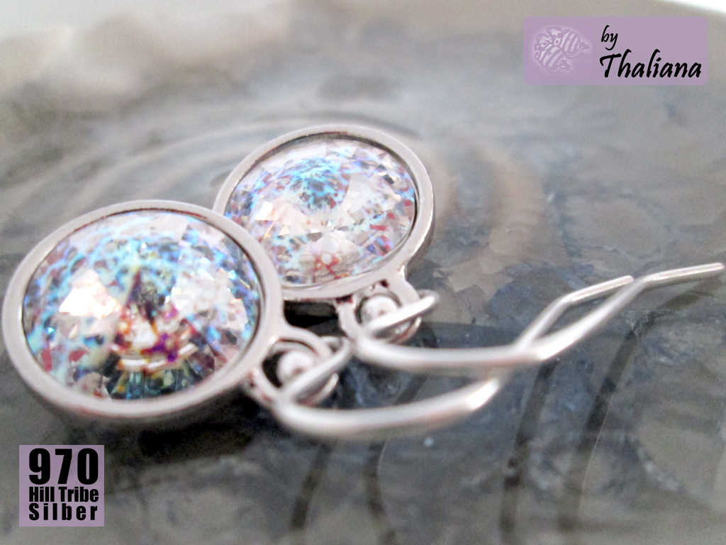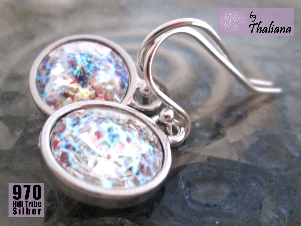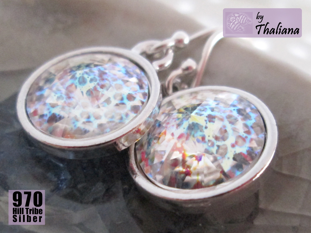 *Funkeln für den goßen Auftritt oder an jedem Tag !* Superschöne, funkelnde Swarovski Elements in Rivoli-Form (glitzernd beschichtet mit Regenbogeneffekt und einer Art Patina, so als würde man in einen alten, wiederentdeckten Spiegel schauen) habe ich montiert in versilberten, sehr hochwertigen Fassungen der Qualitätsmarke TierraCast aus den USA. Die Kristalle fallen mit ihrer Größe von 12mm Durchmesser durchaus auf! Sie baumeln an Ohrhaken aus feinstem 970 Hill Tribe Silber, dem Besten, was der Silbermarkt zu bieten hat. Diese Ohrhaken sind, was die Wertigkeit, Haltbarkeit und Verträglichkeit angeht, wirklich außergewöhnlich und sorgen für jahrelange Freude am Ohr:) Wie alle meine Schmuckstücke werden auch diese Schätze liebevoll, geschenkfertig verpackt, verschickt. *Herstellungsart* Handmade with Love! *Verwendete Materialien* Rivoli Steine (Swarovski Elements), Tierra-Cast Elemente, Ohrhaken aus feinstem Hill Tribe Silber (970) *Größe/Maße/Gewicht* Länge ab Ohrhaken gut 1,5cm. Durchmesser der Rivolis 12mm.