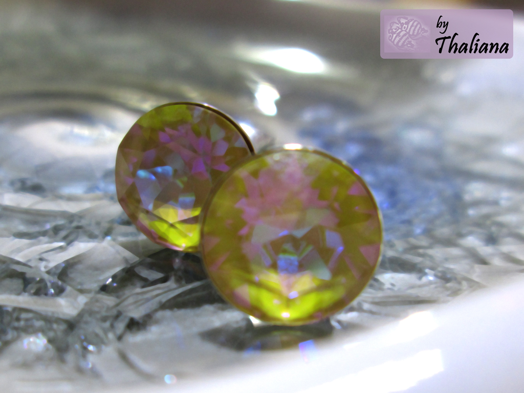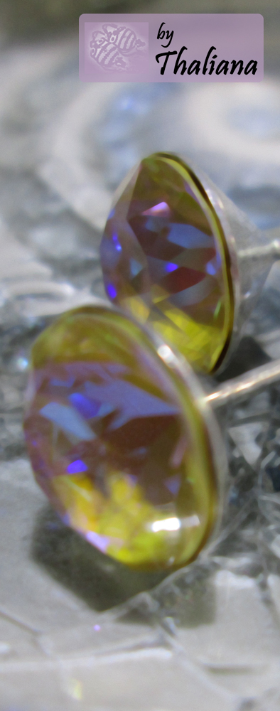 In der qualitativ sehr hochwertigen (sehr gut verträglichen, in Deutschland gefertigten!) Fassung thront jeweils ein 8mm Swarovski Element in der Farbe MYSTIC HONEY - bei den neuen Herbstfarben kombiniert Swarovski satte Farbe auf der Unterseite eines transparenten Kristalls mit genialen Funkeleffekten. Das Funkeln ist bläulich-türkis und beerenfarben und die Grundfarbe ist hier ein heller Ockerton (klingt nicht schön, ist aber in natura ein schön heller, nicht allzu knalliger Farbton, ein dunkleres Gelb.