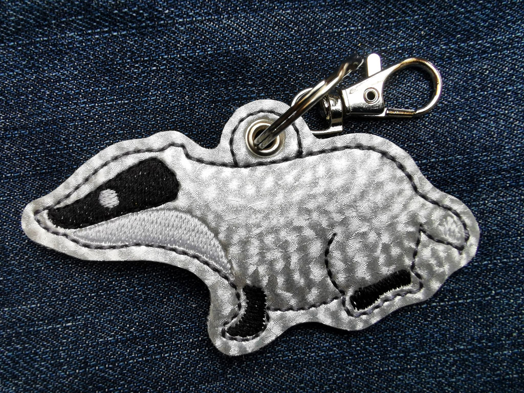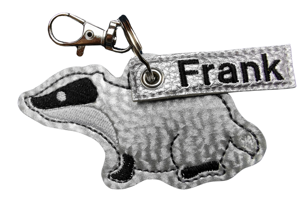 Ein ganz besonderer Glücksbringer!!! Ein Dachs in hellem Silbergrau, gestickt auf Vinyl/Kunstleder. Die Rückseite ist immer farblich passend, gestickt ist auf der Rückseite der Umriß der Kontur. Befestigt habe ich den tollen Glücksbringer an einem silberfarbenen Schlüsselring, zusätzlich versehen mit einem Taschenkarabiner. Natürlich kann das gute Stück damit auch als Taschenanhänger herhalten! Der Anhänger ist inkl. Ring und Karabiner ca. 12cm lang und wird natürlich geschenkfertig verpackt geliefert.