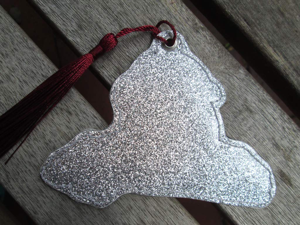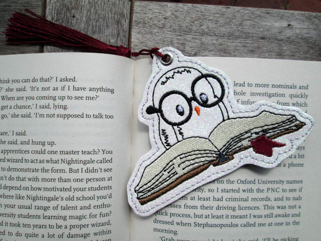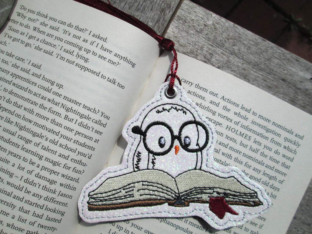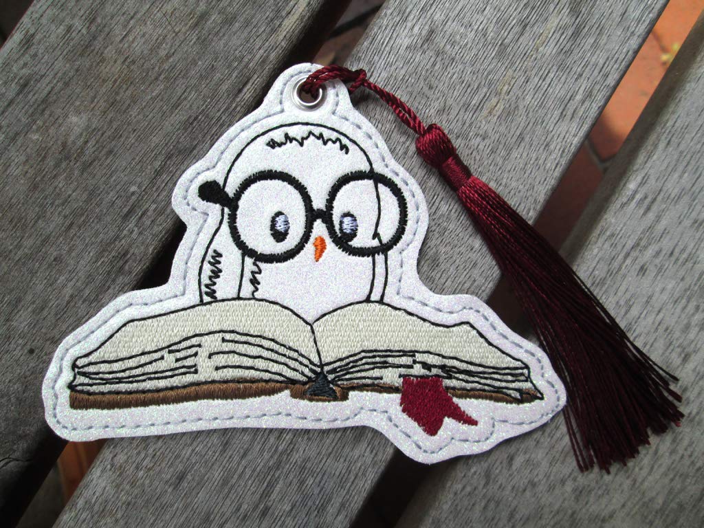 Diese neugierige Leseeule habe ich auf megaglitzerndes weißes Kunstleder gestickt. Die Rückseite ist grau ohne Glitzer.